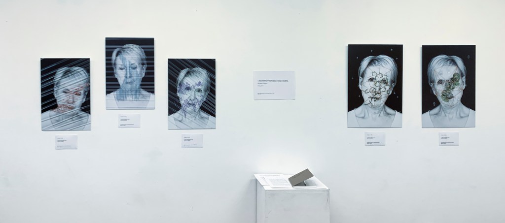 Each self-portrait shows me expressing an emotion. I take a B&W print of the portrait and add embroidery and other stitching to hide that emotion. I also add pins and linking threads making a ‘net’ to mimic how Emotion AI might take a reading from the face. I use stitching so that the solution to being decoded is based on craft, which is more a more human approach than tech.grounded in handiwork and tradition, and so a more. Finally, the addition of glass is about the way we are seen and see ourselves – through the screens, lenses and optic fibres of the Internet.