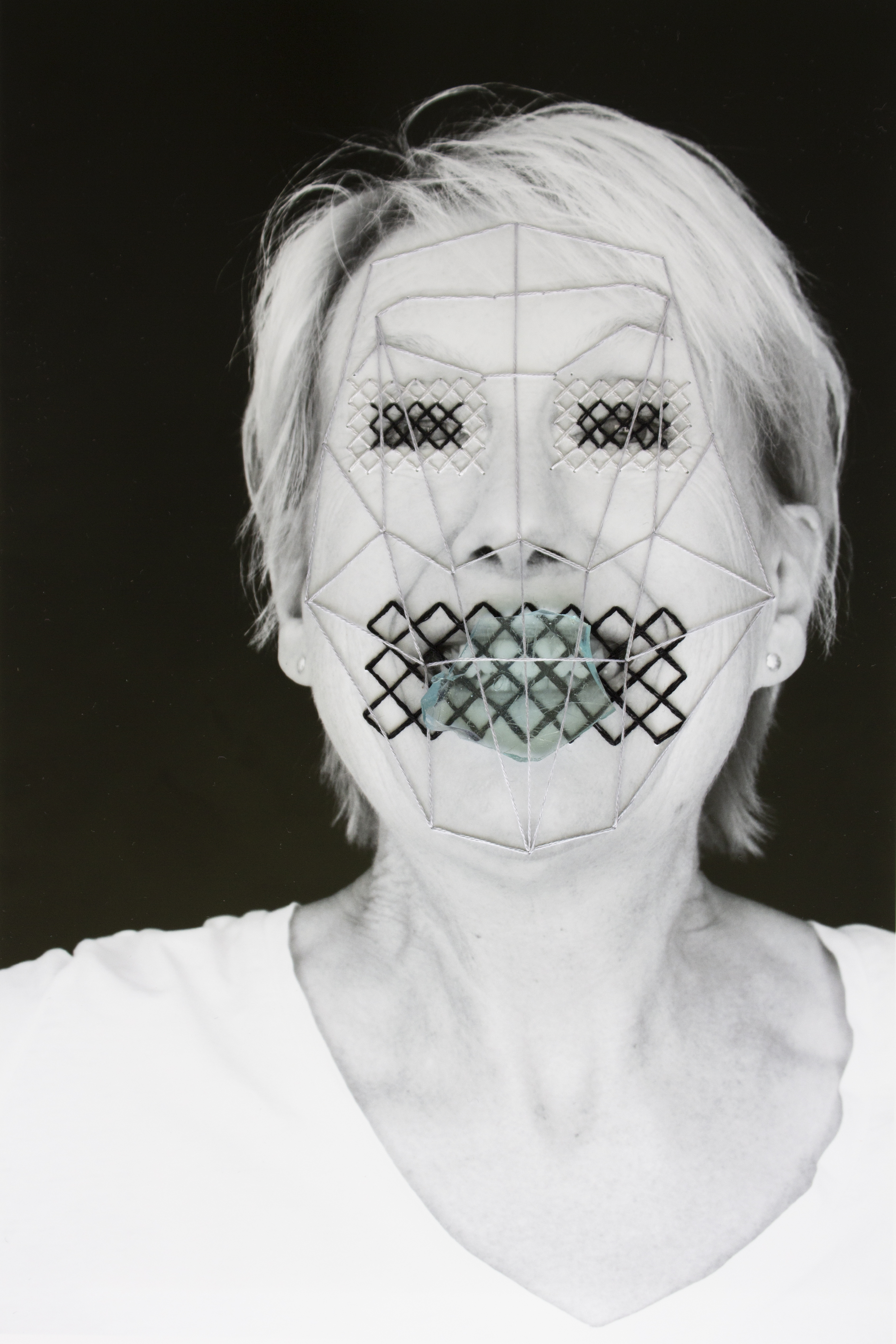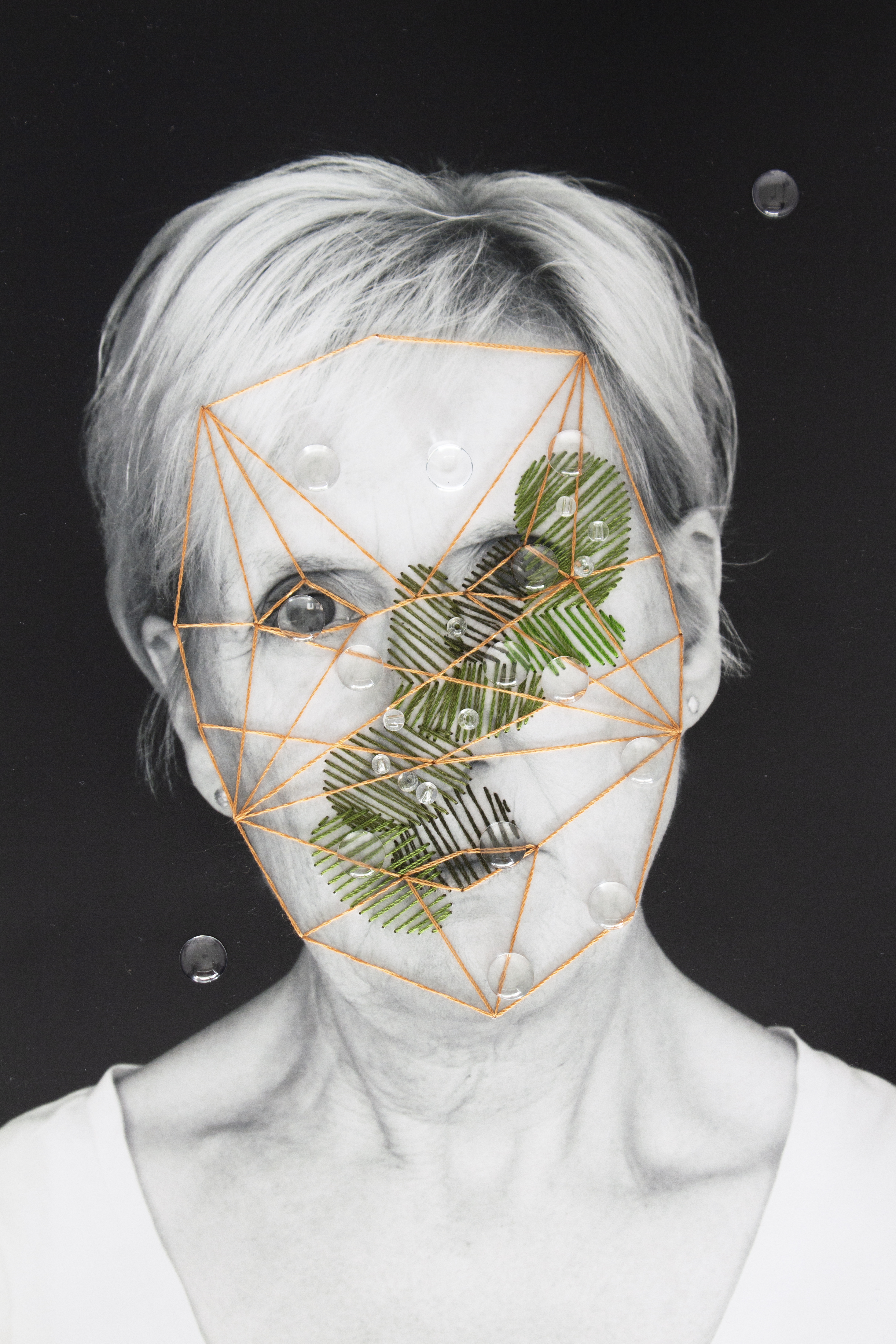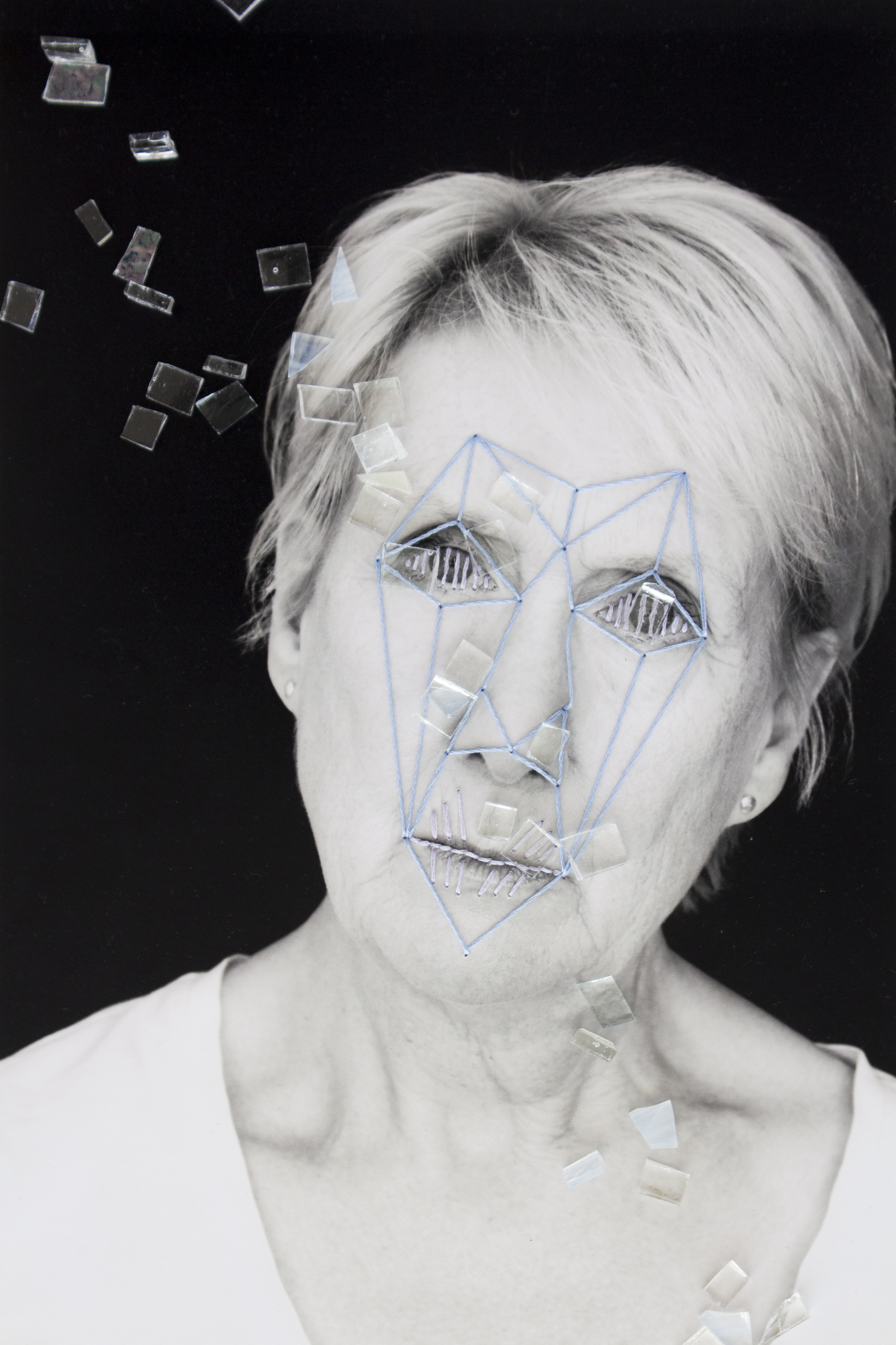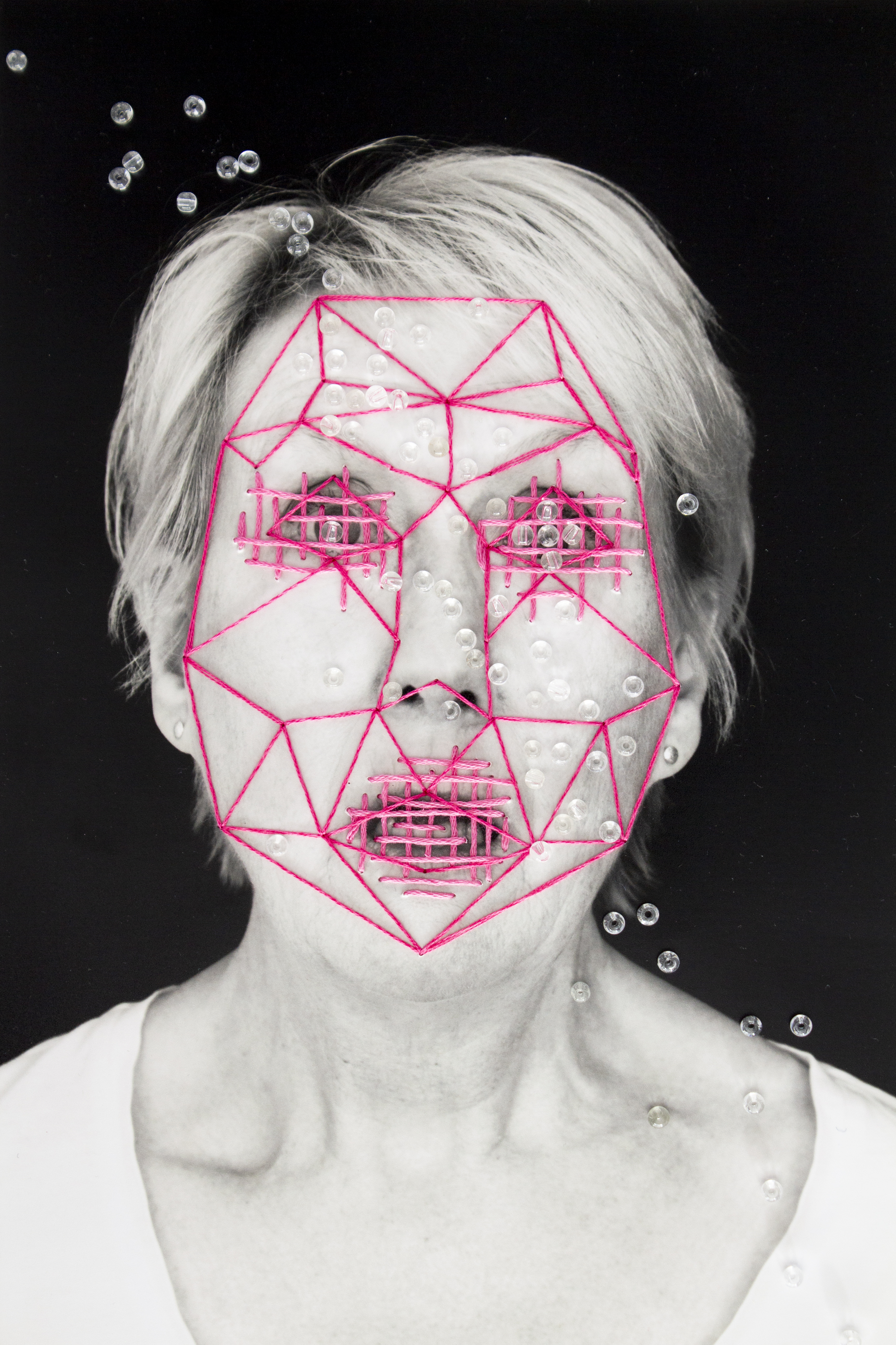 Each self-portrait shows me expressing an emotion. I take a B&W print of the portrait and add embroidery and other stitching to hide that emotion. I also add pins and linking threads making a ‘net’ to mimic how Emotion AI might take a reading from the face. I use stitching so that the solution to being decoded is based on craft, which is more a more human approach than tech.grounded in handiwork and tradition, and so a more. Finally, the addition of glass is about the way we are seen and see ourselves – through the screens, lenses and optic fibres of the Internet.